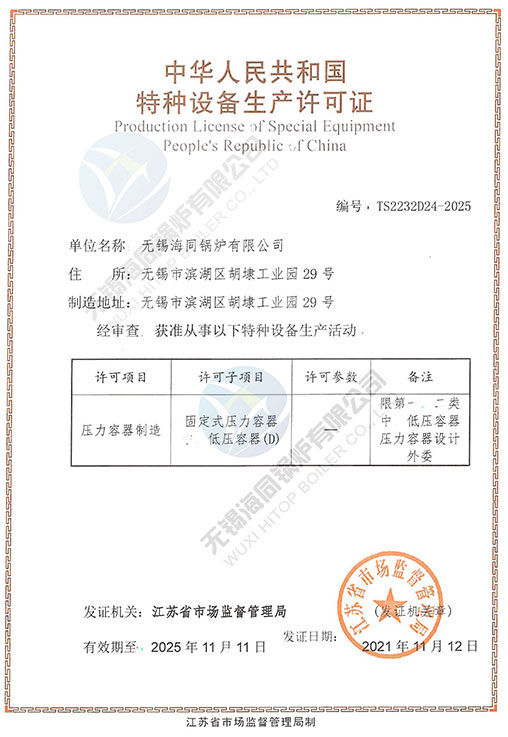 本站訊(特約記者:朱煥昌報道)2021年10月18日,無(wú)錫海同鍋爐有限公司通過(guò)順利通過(guò)“江蘇省市場(chǎng)監督管理局”派遣的專(zhuān)家組評審,各項條件滿(mǎn)足中華人民共和國特種設備“壓力容器”生產(chǎn)許可,并于2021年11月12日喜獲“中華人民共和國特種設備(壓力容器)生產(chǎn)許可證”。